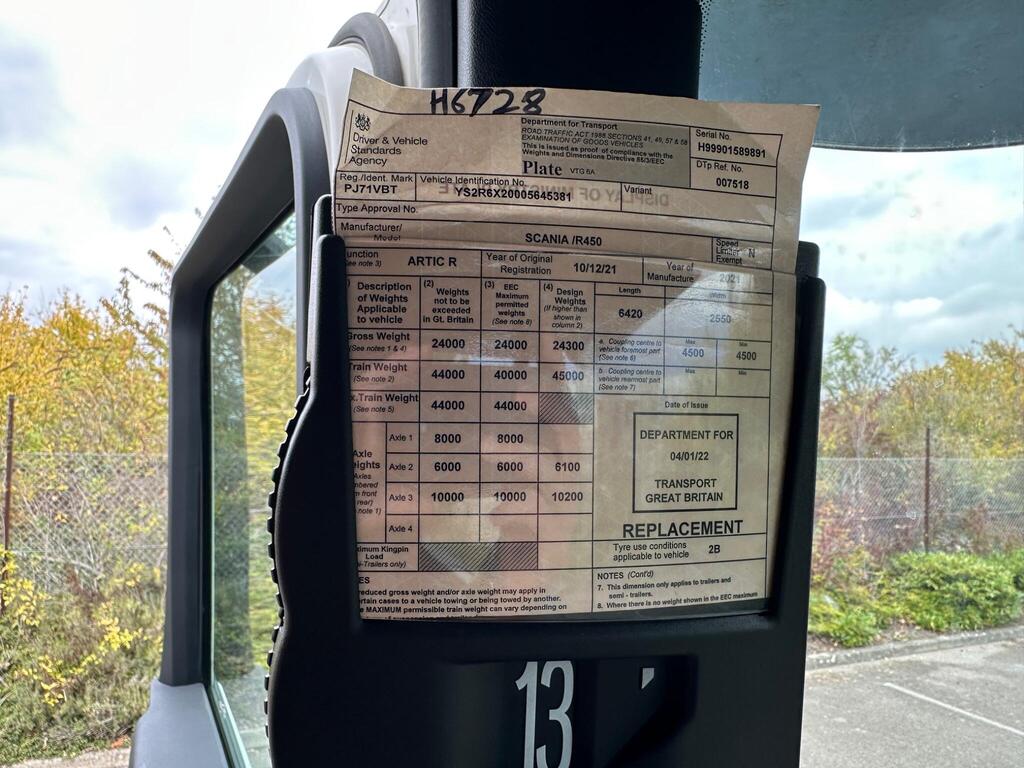 2021(71) Scania R450, 6x2 midlift, automatic gearbox, leather interior, fridge, rear mounted batteries, underslung adblue tank, side skirts, august 2026 MOT, Excellent condition thoughtout.